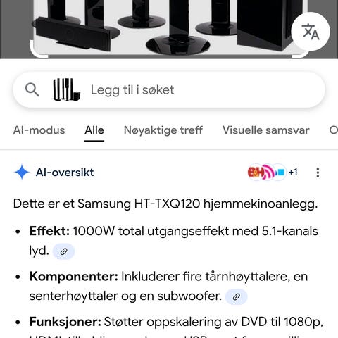 Anlegget er i god stand og fungerer fint. Gir god og klar lyd til film, TV og musikk.