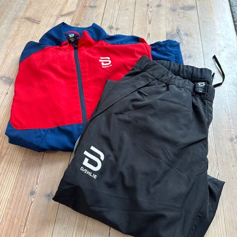 Bjørn Dæhlie langrenns sett bestående av jakke og bukse for barn i størrelse 164 (ca. 14 år). Jakken er rød med svarte felt, hel glidelås foran, høy krage og refleksdetaljer. Den har sidelommer med glidelås og nettingfôr på innsiden. Buksen er svart med elastisk linning, rette ben og refleksdetaljer.