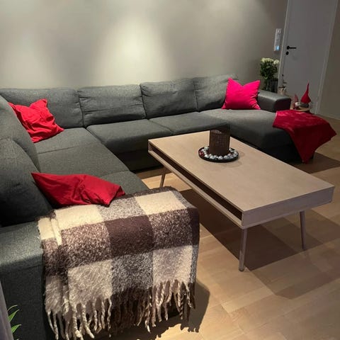 Stor og god sofa for opp til ti pers. Den har noen bruksmerker, men eller i ok stand. Er dessverre litt usikker på målene.