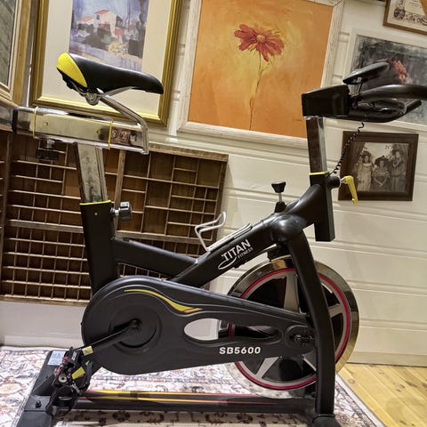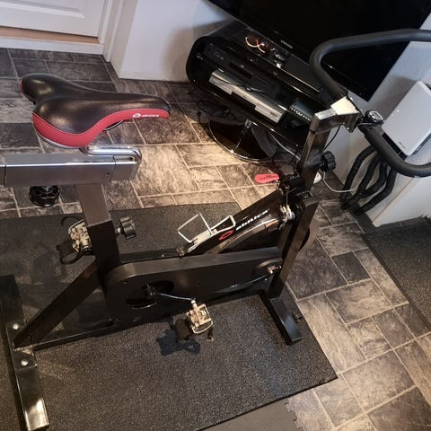 Spinningsykkel i svart utførelse. Sykkelen har justerbart sete og styre, samt pedaler med tåreimer. Egnet for innendørs kondisjonstrening og intervalløkter. Stabil ramme med svinghjul foran og transporthjul for enklere forflytning. Passer til hjemmetrening.