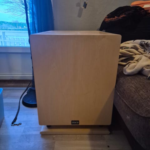 Nesten ikke brukt subwoofer. Meget god både til musikk og film. Kinorommet har blitt til en treningsrom, dermed trenger denne et nytt hjem. Pen og hel.. fungerer utmerket. Denne må hentes pga vekt og størrelse.