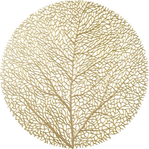 Dekkebrikke i gull, 38 cm i diameter. Av vinyl/pvc, så de er fleksible mht lagring. Har 8 stk, selges samlet.