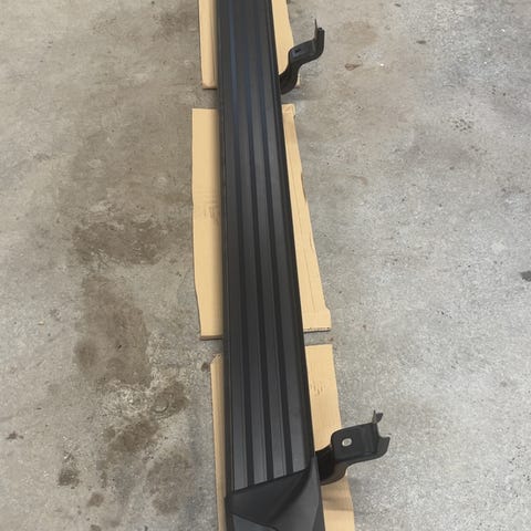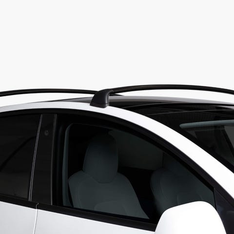 Takrails til Tesla Model Y i svart farge. Settet består av to langsgående rails med tilhørende gummiføtter og braketter. Pent brukt uten skader.