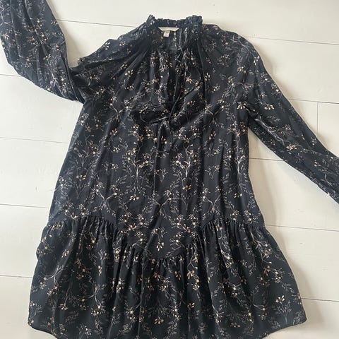 H&M hverdagskjole for dame i størrelse S. Kjolen er svart og laget i viskose. Den har krage med knappestolpe foran og lange ermer. Lommer Skjørtet er lett utsvinget med flere sømmer/volanger som gir en løs og behagelig passform. Egner seg som en enkel hverdagskjole som kan brukes alene eller sammen med strømpebukse eller leggings.