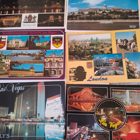 Kort fra Paris, Portugal, Hellas, Tokio, St.Petersburg, Dusseldorf, Malaguf, San Marino Lybeck, Bulgaria for å nevne noen.