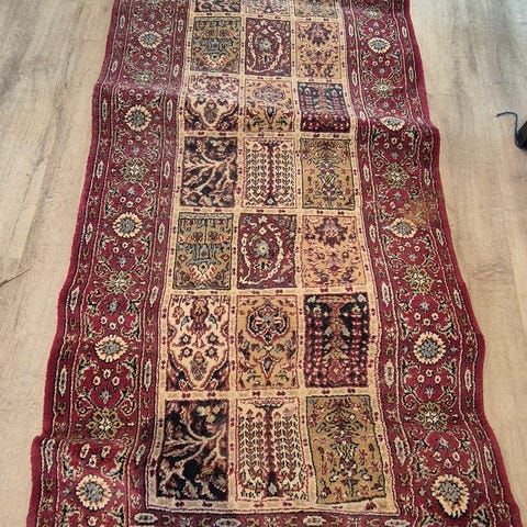 Pent brukt snor-/flatvevd teppe i lilla og beige med fint mønster. Slitesterkt og lett å rengjøre – passer både inne og på terrasse/balkong