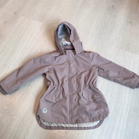 Wheat jakke for gutt i størrelse 104. Jakken er lys brun. Den har avtakbar hette med avtakbar pelskant, glidelås og klaff med trykknapper foran. Lommer i front med knappelukking og rund Wheat-logo påsydd. God til hverdagsbruk.