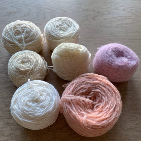 Garnpakke med flere nøster i hvite og rosa nyanser. Nøstene har ulike størrelser og vekt, som vist på bildene. Garnet kan brukes til strikking eller hekling av mindre prosjekter, prøvelapper eller detaljer som kanter og dekor. Materiale og garntype er ikke oppgitt.