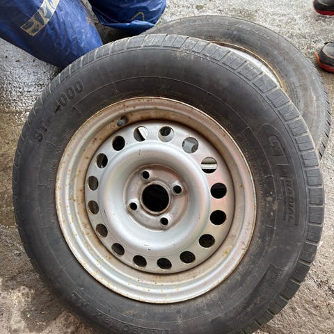 4 stk piggdekk til tilhenger 185R 14C 102/100Q 5 hulls stålfelger. Brukt et par ganger over vidda. Nypris 7580,-