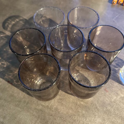 Fem små drikkeglass gis bort. Er glass rommer 1,5 dl.