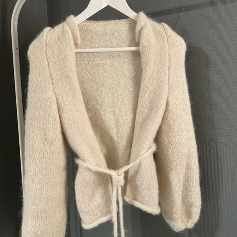 Selger min Bowiesweather strikket i Sandnes garn, Chunky ballerina mohair. Har selv strikket genseren og vil si den er en S. Jeg strikker mye, så nå ryddes det plass i skapet for nye gensere på pinnene🌸🤍🤎🥰