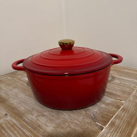 Le Creuset gryte i emaljert støpejern i rød ( cerise ) farge. Gryten har to håndtak og leveres med lokk med metallknott. Innvendig er gryten lys emaljert, noe som gjør det enklere å se innholdet under tilberedning. Passer til bruk på ulike koketopper og i stekeovn, avhengig av platetopp og temperaturgrenser for støpejern og emalje. Egnet til gryteretter, steking og langsom koking av ulike typer