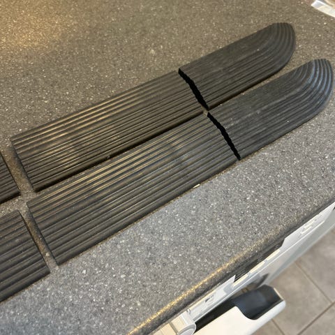 Trappetepper i halvmåneform i grå farge. Teppene har kantbånd rundt og underside med tape for feste til trappetrinn. Egnet for bruk på innendørs trapper for å gi mykere og mer sklisikkert underlag. Selges som sett, antall etter bilder/beskrivelse i annonsen.