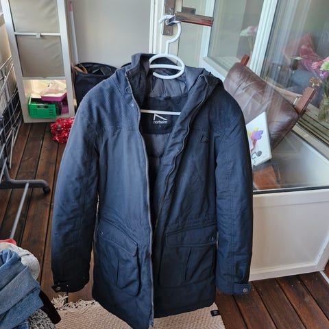 Norheim jakke for dame i størrelse L. Jakken er blå og laget i polyester. Den har hette, hel glidelås foran og glidelåslommer i sidene. Passer som ytterjakke til hverdagsbruk og tur.