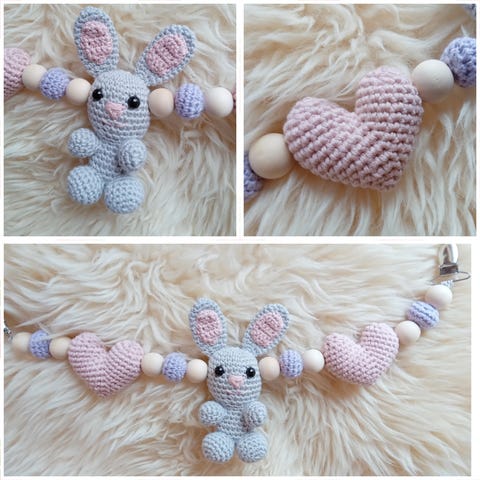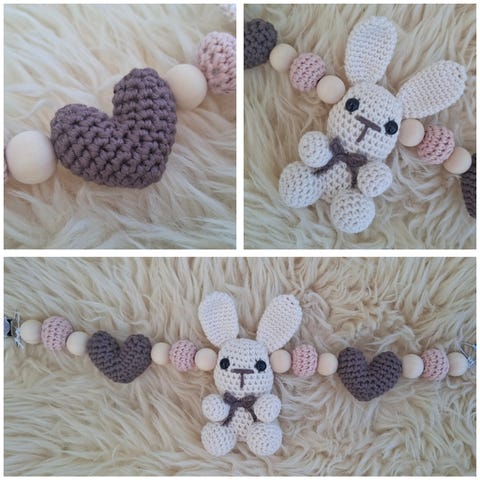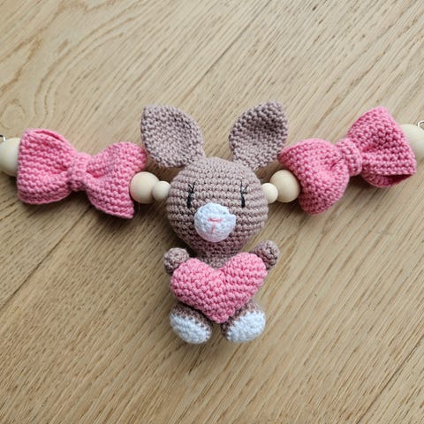 Heklet vognpynt med kanin i beige med rosa detaljer, helt ny og ubrukt. Garn og fyll er i 100% bomull.