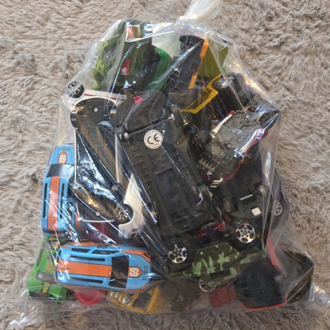 Blandet parti med små lekebiler i metall i flere farger og varianter. Samlingen består av mange ulike typer biler, inkludert personbiler, sportsbiler, terrengbiler og monstertrucker. Bilene er i liten skala, typisk størrelse som passer til lek på gulv, bilbaner eller garasjelek. Egner seg som tilskudd til eksisterende samling av små lekebiler eller som utgangspunkt for ny samling.25 stk hot wheels biler også i samlingen.Selges samlet som vist på bildene.