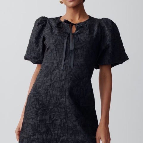 Svatt Gina Tricot festkjole i størrelse XS. Den har tettsittende passform, lange ermer og dyp utringning. Lengden går omtrent til over kneet. Egnet som penkjole eller festkjole for dame.
