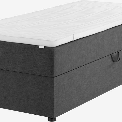Sengen har grå tekstiltrekk og oppbevaring i underdelen (åpnes fra sidene).
