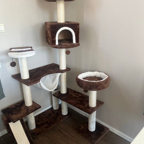 Klatrestativ for katt med flere nivåer og liggeplattformer i beige tekstil. Stativet har stolper med sisal for kloring, en liten hule nederst med åpning, samt flere plattformer i ulike høyder. Egner seg for innendørs bruk til klatring, lek, hvile og kloring for katt. Stativet plasseres frittstående på gulv nær vegg eller i et hjørne for ekstra stabilitet. I god stand bortsett fra på baksiden av hula og på nederste nivå. Se bilder. Stolpene er hele. Katten vår elsket å være der.