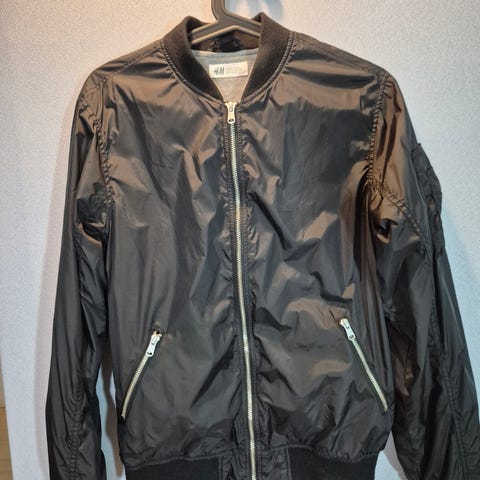 H&M bomberjakke, ytterjakke i størrelse 164, ca. 13-14 år. Jakken er mørkblå og laget hovedsakelig av polyester. Modellen har glidelåslukking foran, ribbestrikket kant i hals, ermer og nederkant, samt sidelommer med knapp. Det er også en lomme med glidelås på ermet. Jakken har vattert fôr i polyester for ekstra varme. Passer til hverdagsbruk i overgangssesonger. Pent brukt. Hentes på Torshov. Heis. Buss 20 og 30 stopper rett utennfor.