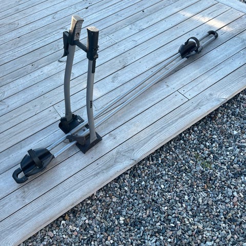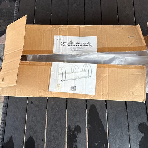 Sykkelstativ i gulvmodell i svart metall og plast. Består av flere deler som kan brukes til å holde og organisere sykkel stående på gulvet.