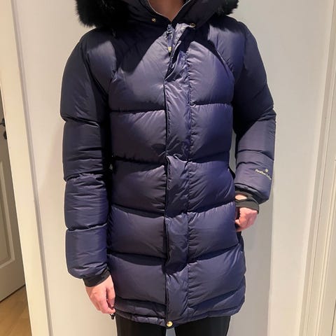 Jakken er mørkeblå og fylt med dun. Den har hette, høy krage og glidelås med knappestolpe foran. Modellen har lengde ned mot låret og to store frontlommer.