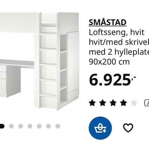 IKEA SMÅSTAD loftseng med skrivebord og oppbevaring i størrelse 90x200 cm, i hvit utførelse. Sengen er bygget i høyden med stige på siden og har integrert skrivebord under liggeflaten. Under og ved siden av skrivebordet er det skuffer og åpne hyller som gir oppbevaringsplass for klær, bøker eller leker. Løsningen er egnet der man ønsker å kombinere seng, arbeidsplass og oppbevaring på et begrenset areal.