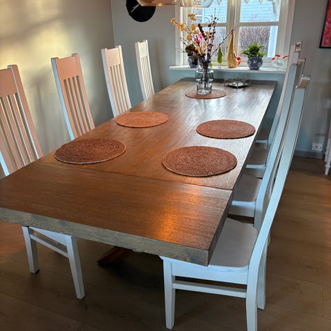 Spisebord i heltre eik 200x100 + 2x50cm forlengere og 6 stoler selges. Bordet trenger en runde med olje. En av stolene har er lite rift.