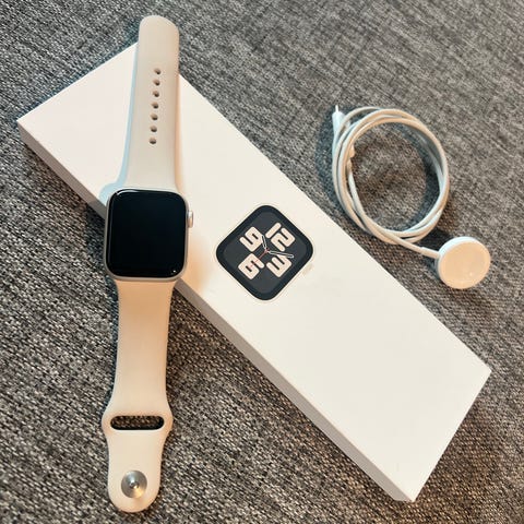 Apple Watch Series smartklokke i hvit farge med sportsreim. Rektangulær skjerm med berøringsfunksjon og digital krone på siden. Baksiden har optiske sensorer for måling av blant annet puls. Klokken leveres sammen med magnetisk ladekabel med USB‑C‑tilkobling. Egnet til bruk sammen med iPhone for varsler, aktivitetsmåling og andre smartwatch-funksjoner. Apple Watch har litt skrapa på skjermen men det viser på bilde