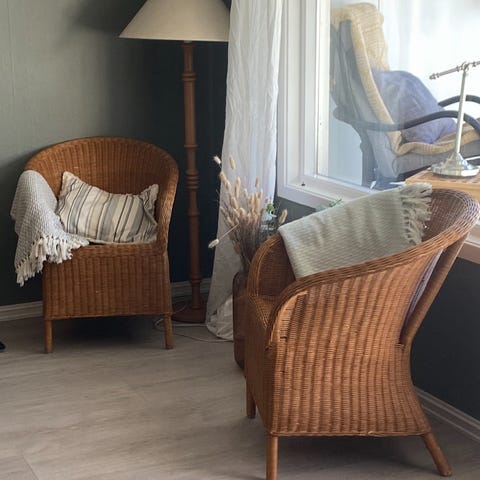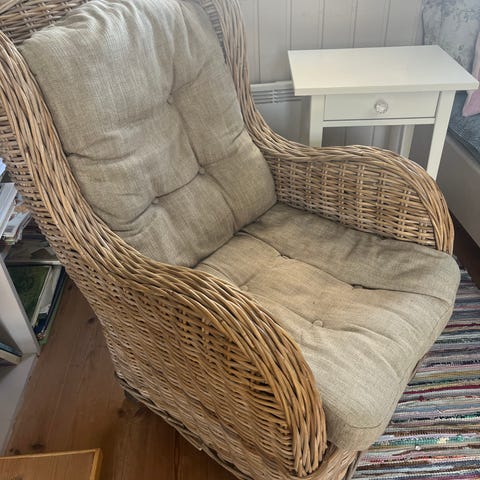2 ubetydelige brukte kurvstoler selges (helst samlet). 2 puter følger med. Har alltid stått inne.