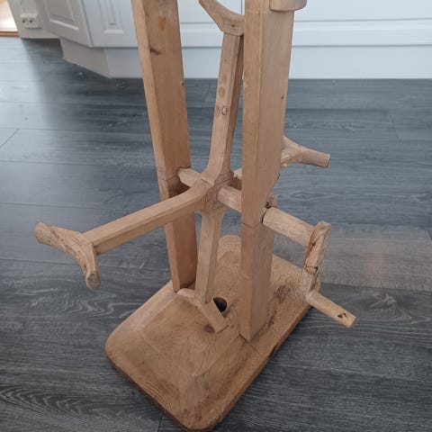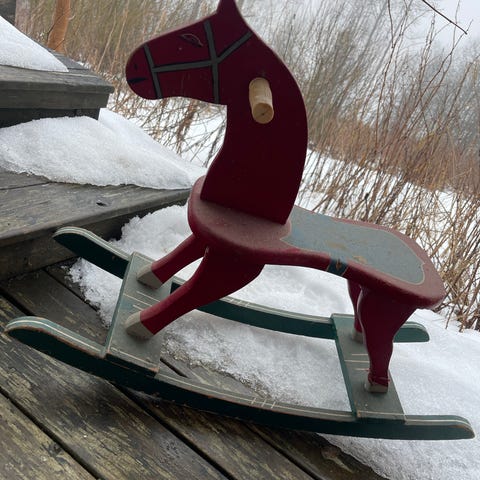 Tre gyngehest i sykkelformet design. Leken er laget i heltre med utskårne detaljer, sete og håndtak foran. Montert på medar som gir gyngefunksjon. Passer som leke og som innredningsdetalj på barnerom eller lekerom. Merke og nøyaktige mål er ikke oppgitt.