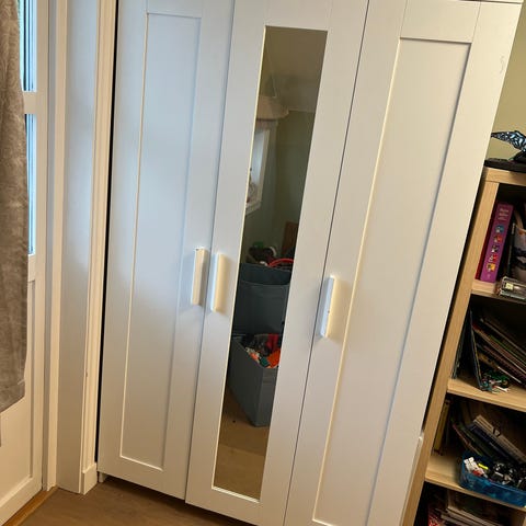 2 stk garderobeskap, hvit med speil. Selges kr 1500,- pr stk. Pent brukt. Må hentes på Heimdal.