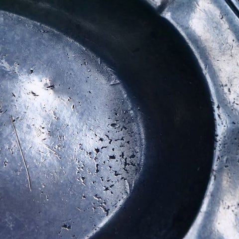 Se bilder, et stort [ ca hele 42 cm i diameter] tinnfat fra som jeg mener er fra 1700 tallet, er gravert inn initialer på baksiden. Har 2 stempler,men klarer ikke helt å tyde de, se bilder, selges som den er kr 1400.