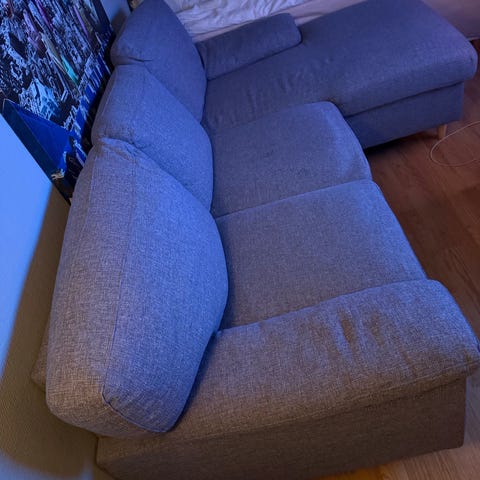 Jeg selger en pent brukt vinkelsofa i blått stoff. Mål 286cm x 210cm, med løse puter og avtagbart stoff. Sofaen er helt uten skader og flekker og meget god og sitte i. Ikke for myk. Det er ingen som røyker i huset og vi har ikke dyr.