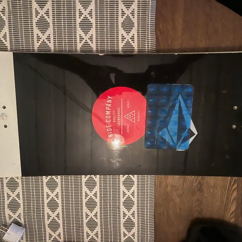 Godt brukt brett, type Legend snowboard med bindinger i svart/rød farge. Brettet har grafikk med tallet 28 på oversiden og teksten «Legend» på undersiden. Inkluderer monterte snowboardbindinger med justerbare stropper.