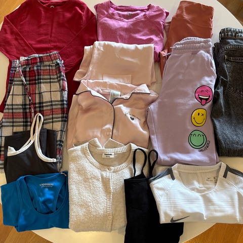 4 hettegensere, 2 gensere, 1 bluse, 2 jeans, 1 joggebukse, 1 tights, 2 pysj bukser, 2 shorts, 1 skjørt