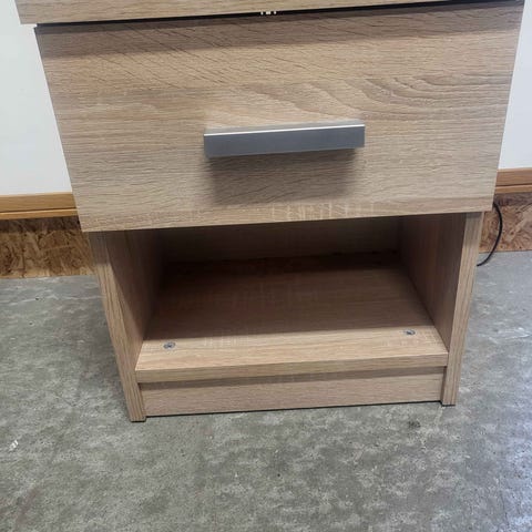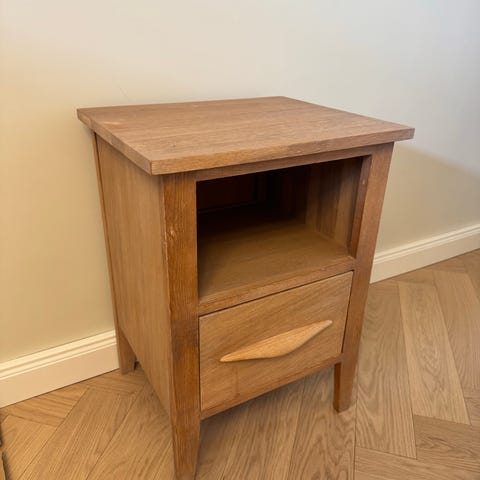 To pent brukte nattbord i lys eik.En skuff og en hylle under.