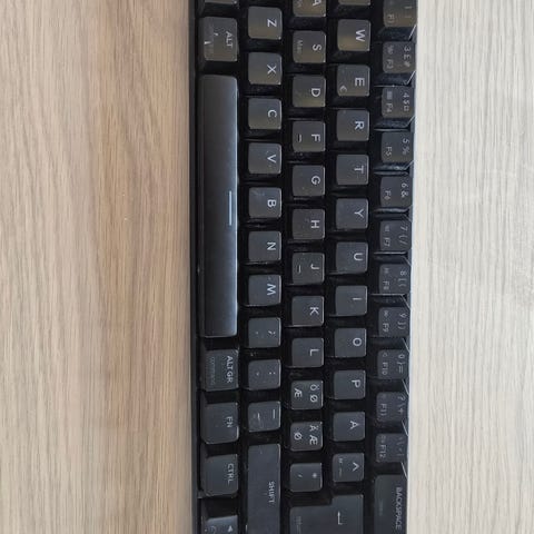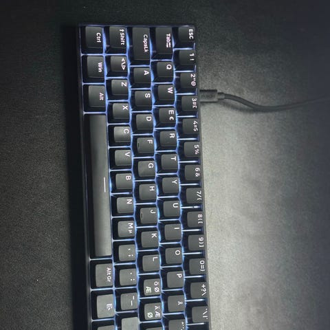 Logitech G Pro X 60 gamingtastatur i 60 % kompakt størrelse. Tastaturet har svart chassis og svarte taster med blå merkninger. Det er et mekanisk tastatur beregnet for gaming og generell PC-bruk, med numeriske taster integrert i hovedoppsettet i stedet for egen numpad. Passer for brukere som ønsker et plassbesparende tastatur til skrivebord eller gamingoppsett.
