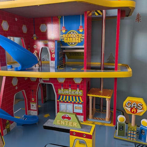 Det følger med ulike smådeler som møbler, innredning og figurer, samt kjøretøy som kan plasseres i garasjen