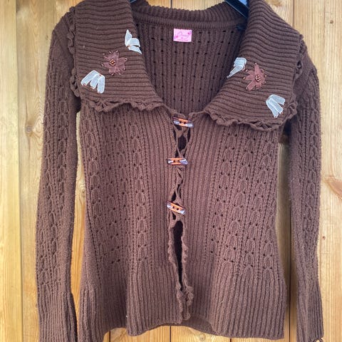 Har en litt shredded look med løse tråder fra ermer og bunnen av cardiganen