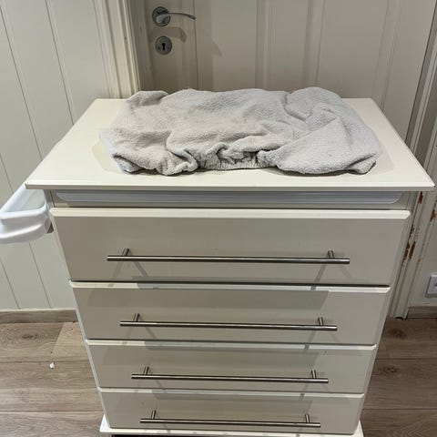 IKEA stellekommode med integrert babybadekar og fire skuffer. Kommoden har hvit ramme og lyse fronter med fargede håndtak. Øverst er det lokk som kan brukes som stelleflate, og under lokket er det innebygd badekar i plast. På siden foran er det en avtagbar plastbeholder med rominndeling til oppbevaring av småting. Enheten står på hjul for enkel forflytning. Egnet til stell og bading av baby samt oppbevaring av klær og utstyr på barnerom eller bad.