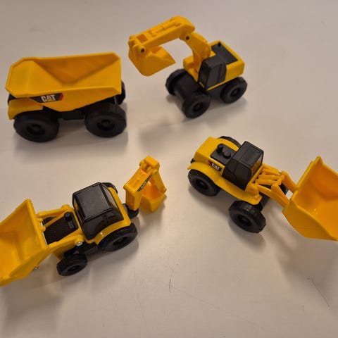 Pent brukt sett av lekekjøretøy anleggsmaskiner selges. Kan også fint brukes som kakepynt. Settet består av flere små anleggskjøretøy som traktor, dumper og gravemaskin.