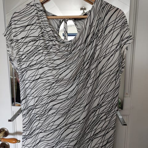 H&M hverdagskjole for dame i størrelse L. Kjolen er flerfarget med grafisk mønster i hovedsakelig mørke og lyse toner. Den er laget i polyester, som gir et lett og glatt stoff. Modellen har korte ermer og rett fasong.