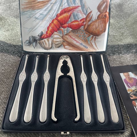 Hardanger Bestikk skalldyrgafler sett 6 deler. Består av seks små gafler beregnet til skalldyr, levert i original eske merket «Skalldyrgafler». Hver gaffel har dekor med hummermotiv på skaftet.