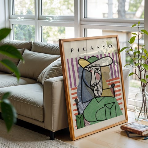 Pablo Picasso L’Odalisque et le Clown kunsttrykk. Motivet viser en figurkomposisjon i atelier, utført som flerfarget trykk med linjetegning. Trykket er en reproduksjon fra 1954, tilknyttet Collection du Musée de Céret, opplag 500 eksemplarer.