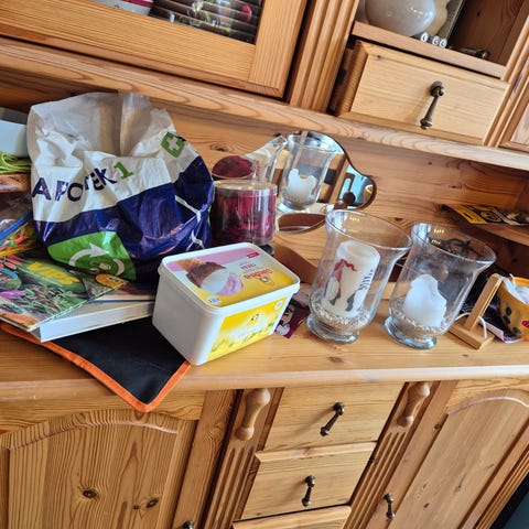 Pent brukt seksjon. Det som ligger på toppen er hjørne hyller i samme stil som skapet. Må hentes.