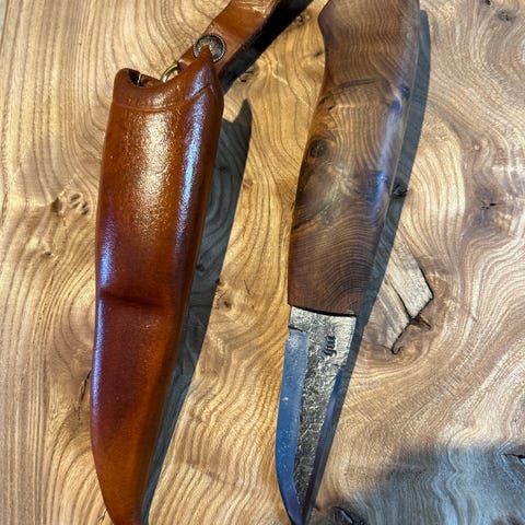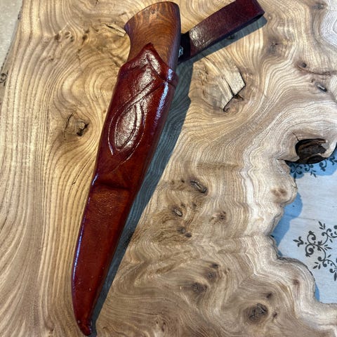 Håndlaget turkniv med treskaft og lærslire