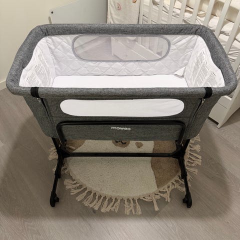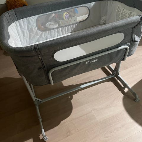 Nesten ubrukt babyseng / bedside crib fra Moweo selges rimelig. Senga kommer med madrass og reisepose.
