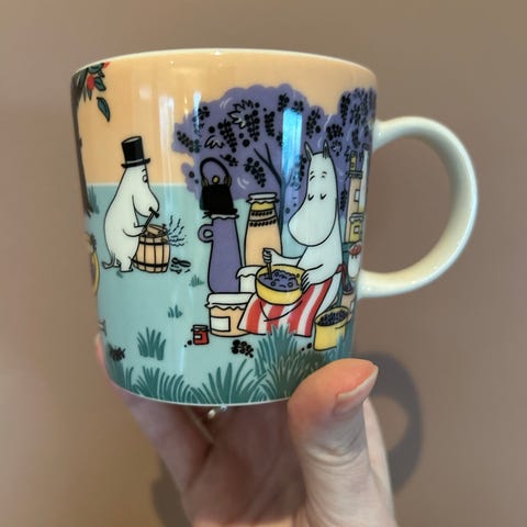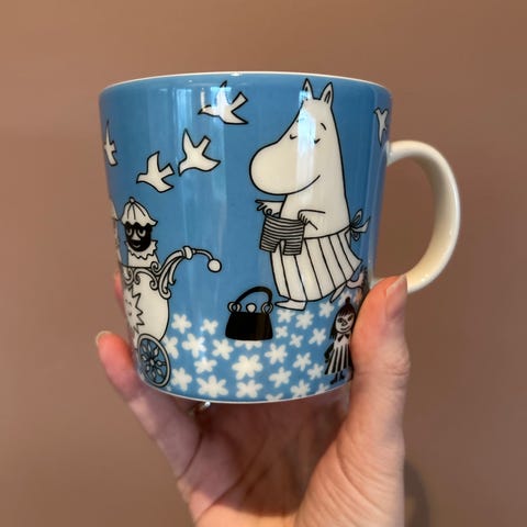 Arabia Mummikrus med vintermotiv fra 2022. Vinterens under. Koppen er laget i porselen og har illustrasjoner med Mummitroll-figurer i vinterlandskap. Egnet til varme og kalde drikker i hverdagsbruk eller som samleobjekt for Mummi-serien fra Arabia.
