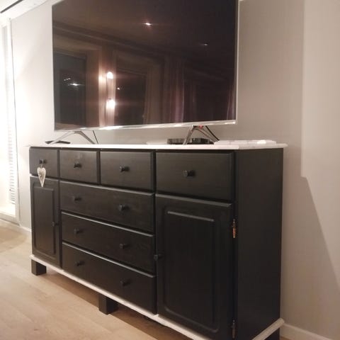 Selger en svart sjenk/hylle. Den er pent brukt, og selges da vi skal flytte. Fin til oppbevaring/pynt osv.